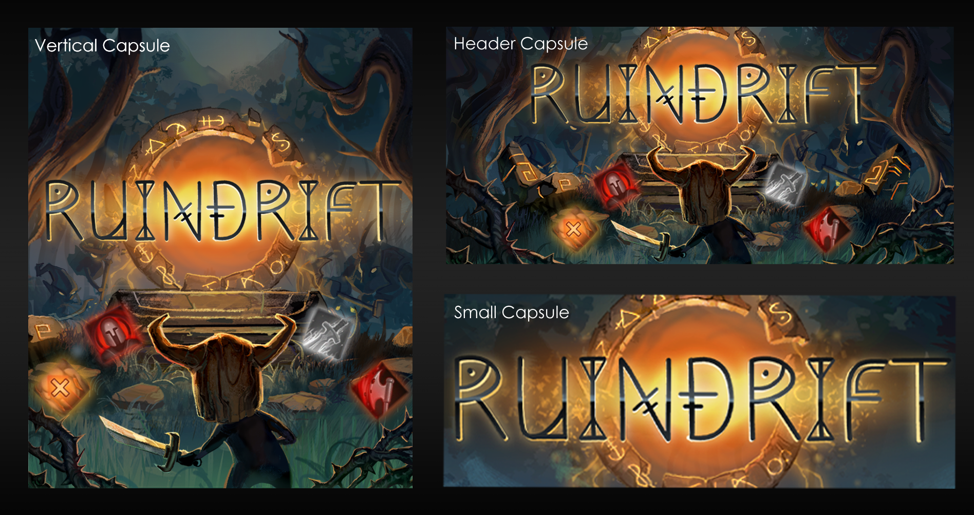 , to be used as Steam page assets for an upcoming game. Casper designed visuals based on a brief to fit varying capsule formats, also developing the title logo.